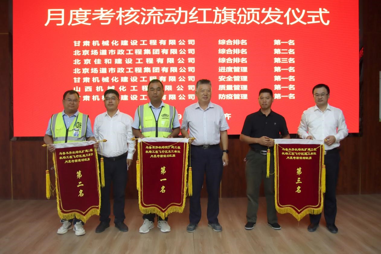 此次會議對施工單位八月份的相關(guān)工作進(jìn)行了綜合考核,我司烏魯木齊機(jī)場項目經(jīng)理部在8家施工單位評比中獲得綜合第一名、安全第一名、防疫第一名的好成績,得到了業(yè)主方、擴(kuò)建指揮部及監(jiān)理單位的一致認(rèn)可。同時會議對九月份全場飛行區(qū)工程的相關(guān)工作進(jìn)行了部署,下達(dá)了各標(biāo)段施工任務(wù)。