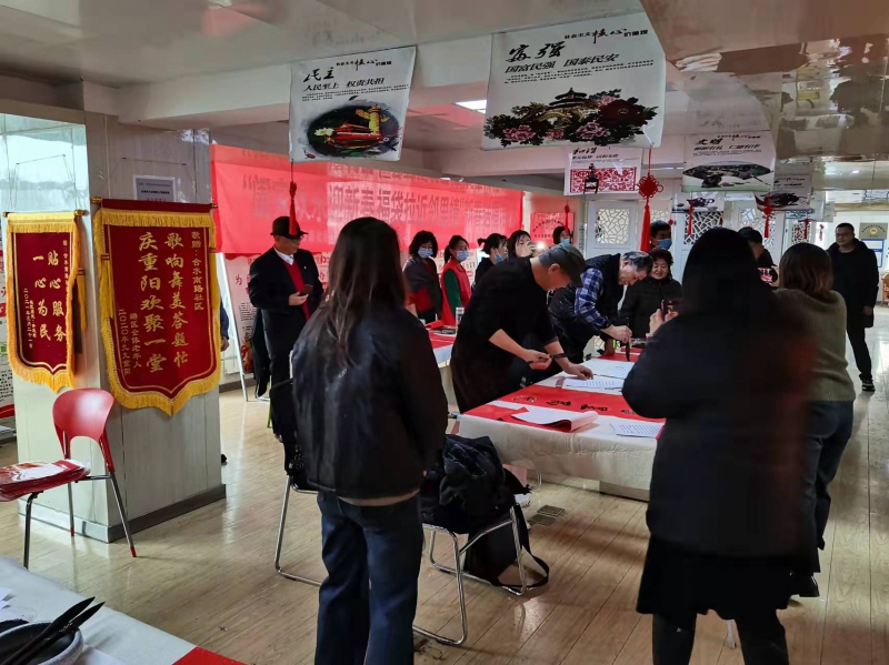 書(shū)法有行、隸、草等多種書(shū)法體,大家相互交流,相互學(xué)習(xí)。書(shū)法愛(ài)好者們將一副副飄著墨香的“?!弊炙偷骄用袷种?,同時(shí)也把祝福和溫暖送到每位居民的心坎上。